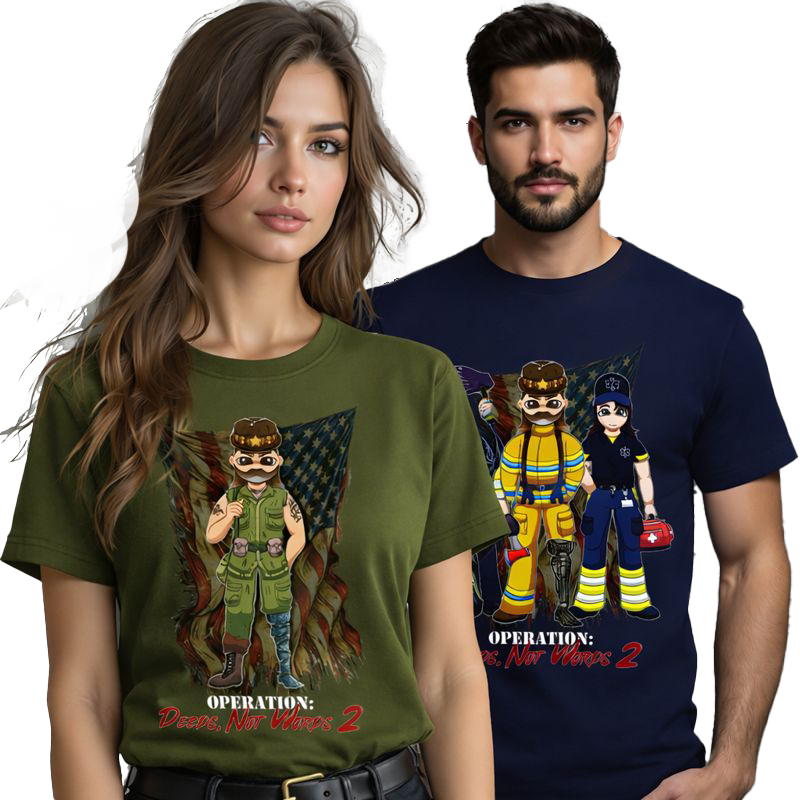 This tier gets you 2 Limited Edition BLACK shirts AND a custom drawing of you in the Fatman Operation: Deeds Not Words 2 pose or your choice of one of 4 First Responder poses by The Fatman Nation official artist, Haley Gray that you could use in your marketing to show your support of Disabled Veterans and First Responders. These custom shirts will only be available for sale at LIVE shows so our supply is very limited.